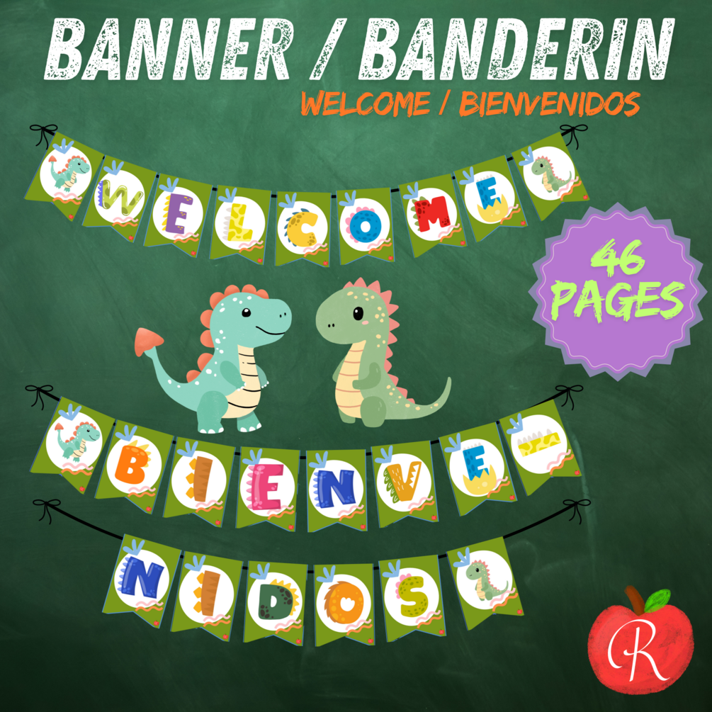 🦖 Welcome your students or guests with a fun, dinosaur-themed banner in both English and Spanish! This digital download includes 4 PDF files with adorable dinosaur images and prehistoric-style letters, perfect for adding charm to any classroom or home 🏠🎉. Available in A4 and Letter sizes, it’s great for decorating doors 🚪, walls, or any space you want to fill with creativity 🎨. Ideal for back-to-school or special events ✏️🎈. Download and print instantly after purchase! 📥🖨️